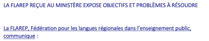 • 7 février 2019 La FLAREP expose ses vives inquiétudes face à la menace des réformes pour l'enseignement des langues régionales - 2 RV au Sénat et au Ministère -
