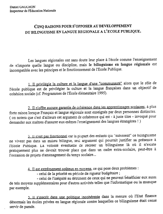 5 raisons pour s'opposer au développement du bilinguisme en langue régionale à l'école publique